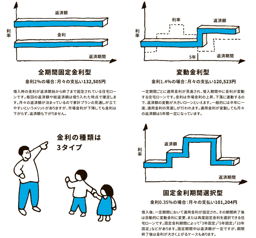 住宅ローンには3種類あり、最近は「固定金利期間選択型」が主流になっています。最初の数年間は低金利で設定されているのが魅力ですが、その後の変動は金融機関によって変わってきます。様々な住宅ローンのメリット、デメリットを調べることが大事です。