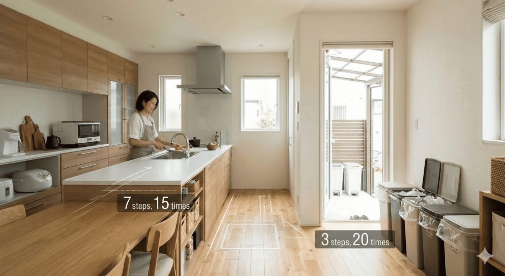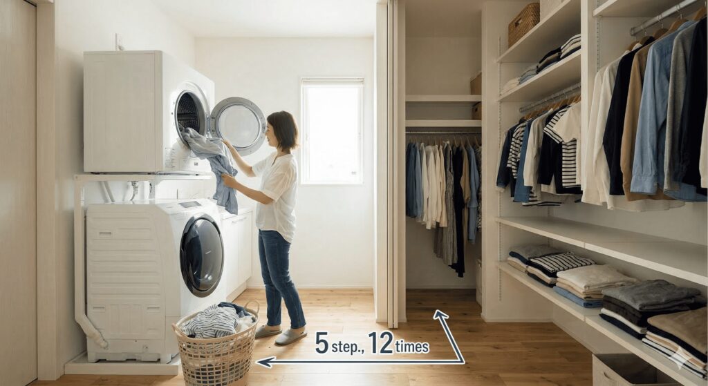 1. 「家事動線」は長さではなく「歩数」と「回数」 多くの人が「キッチンから洗面所が近い」ことを重視しますが、本当に大切なのは「1日にそこを何往復するか」です。例えば、洗濯機から干し場、そしてクローゼットまでの距離を「10歩以内」に収めるだけで、家事のストレスは劇的に減ります。2026年の共働き世帯において、この「歩数の削減」はもはや贅沢ではなく必須のスペックです。