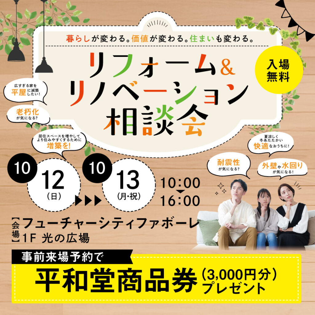 10月12日、13日の2日間、フューチャーシティファボーレ1階光の広場にてリフォーム会社が6社集結。リフォーム&リノベーション相談会開催。